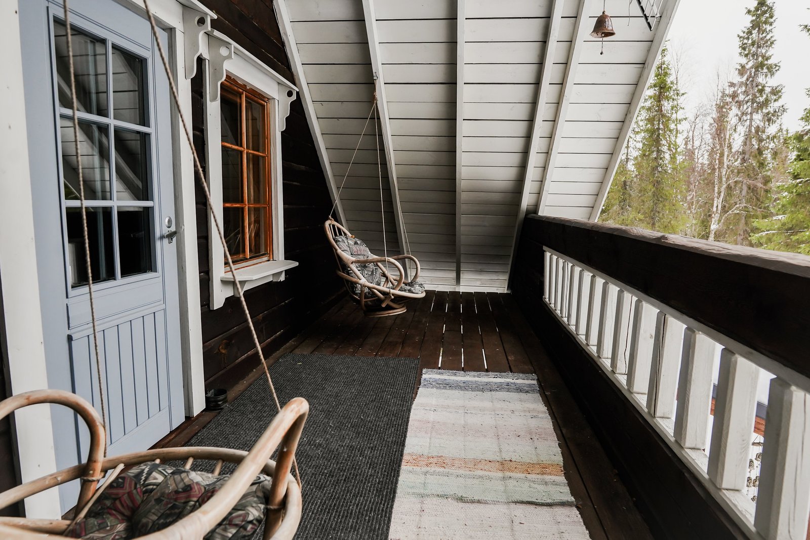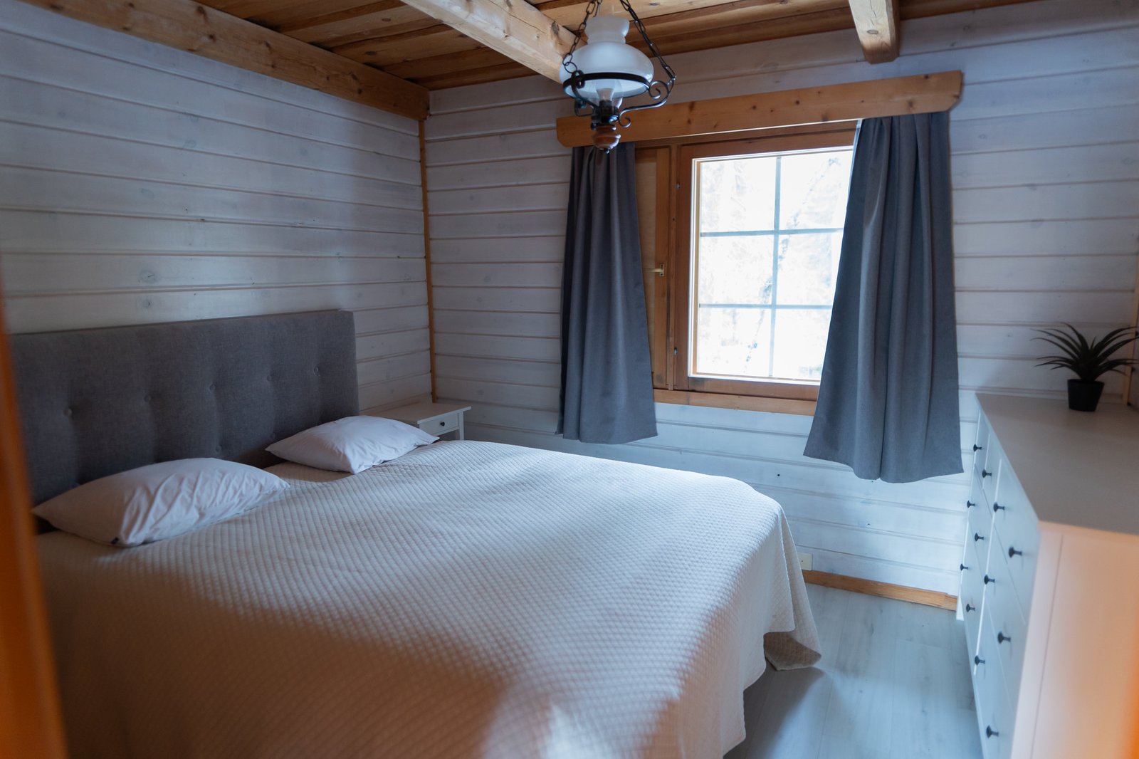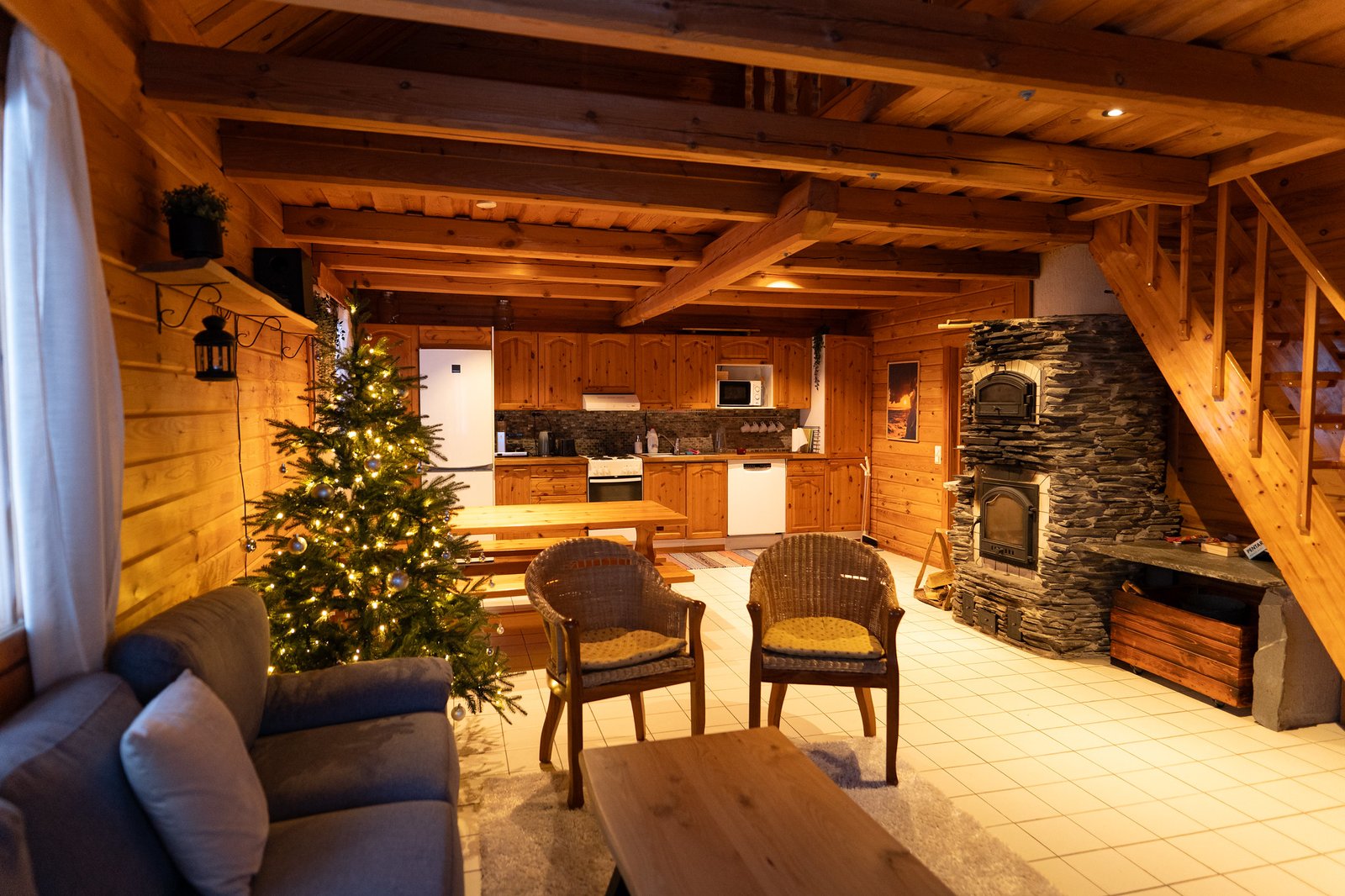 The chalet has 3 bedrooms, a living room, a kitchen, and a bathroom with a sauna. It’s ideal for larger or multi-generation families, and groups of friends. The cottage has a double bed and two twin bedrooms upstairs. There are 2 more single beds available on the alcove upstairs.