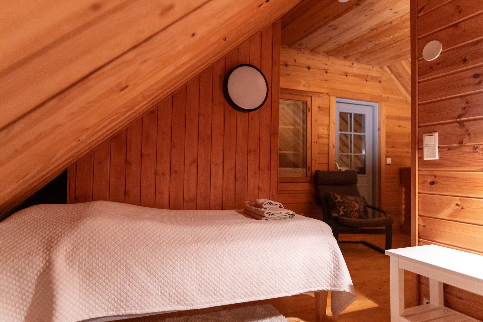 The chalet has 2 bedrooms, a living room, a kitchen, and a bathroom with a sauna. It’s ideal for couples, small families, and small groups of friends. The cottage has a double bed (alcove on the ground floor) and a twin bedroom upstairs. A sofa bed in the living room can accommodate one more person.